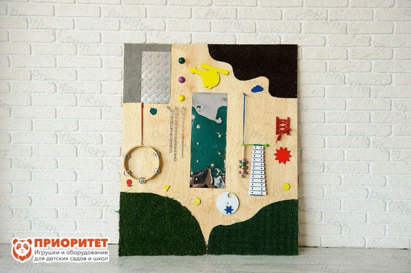 Для тех, кто стремится украсить интерьер игровой комнаты, сделать его полезным и интересным для ребенка, предназначена эта акустическая тактильная панель. Это большой по размеру прямоугольник, который содержит множество деталей. У него есть два главных отличия от бизиборда: