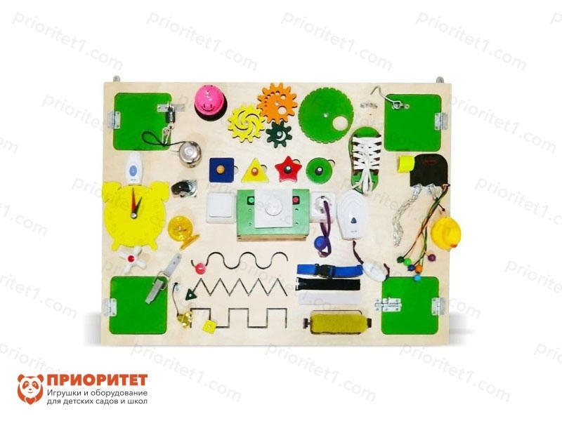 - Также он изучает бытовые навыки, когда используется предметы вроде выключателей и кранов. И повторяет цветовую палитру, ведь на бизиборде много цветных элементов.