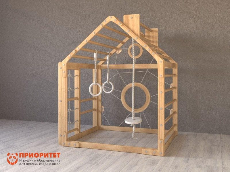 - Данный домик можно легко адаптировать и дополнить различными гимнастическими элементами, такими как веревочные качели, гимнастические кольца и другие атрибуты, что делает его более разнообразным и увлекательным.