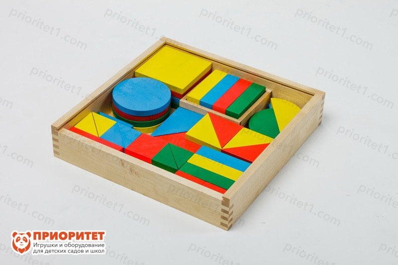 Яркий цветной комплект геометрических фигур используется для развивающих занятий детей дошкольного возраста. В наборе: деревянный ящичек и множество различных треугольников, квадратов, кругов, прямоугольников.