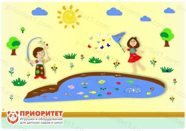 - Изделие состоит из основы, сделанной из фанеры, и красочных картинок (текстиль), изображающих лето: озеро, рыбки, мальчик, девочка, облака, бабочки и пр.