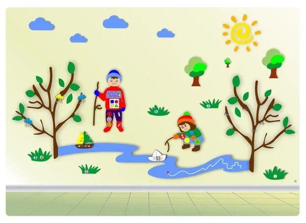 - Модель и весна. Панели создают весеннее настроение своей цветовой палитрой, формой и предметами, которые на них изображены. На картинке можно увидеть детей, играющих в весеннем саду. Здесь же расположены деревья, ручеек и солнышко.