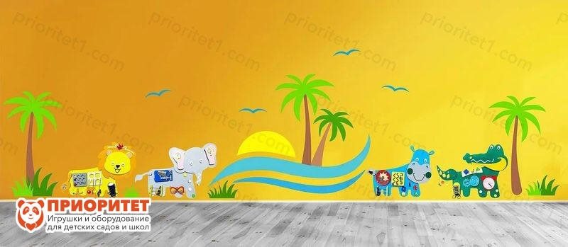 Комплексное настенное решение «В жаркой Африке» - это тематический развивающий комплекс, который погружает детей в теплую и солнечную Африку. Это отличное оборудования для детского сада, дошкольных учреждений и иных развивающих центров. Комплексное настенное решение можно устанавливать, как в зоне входной группы, так и для обустройства игровых комнат. Яркие и насыщенные цвета привлекут внимание детей, подарят им позитивный настрой на весь день.