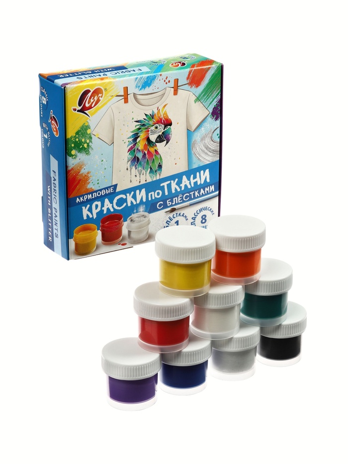Акриловые краски для ткани, 9 цветов с блёстками — набор для создания ярких и выразительных рисунков на одежде, сумках и других текстильных изделиях. Комбинация классических оттенков и сияющих акцентов помогает добавить деталям глубину и праздничное настроение.
