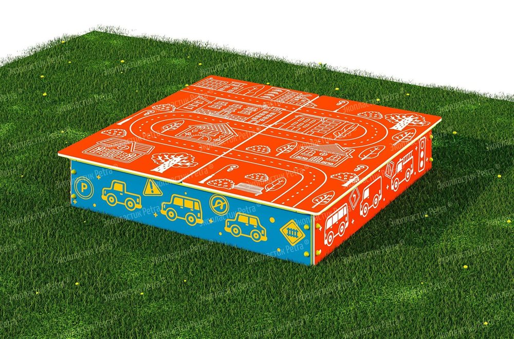 1.Крышка из цельнолитого атмосферостойкого Экопластика с эффектом кожи (толщина не менее 15 мм) и рисунками на изделиях нанесенными гравировкой в виде дороги, проходящей по населенному пункту для ишры в машинки
