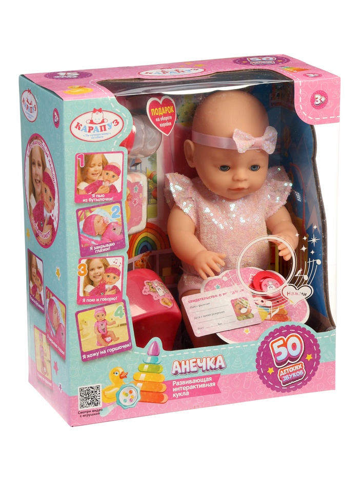 «Анечка» — это игровая кукла-малышка, с которой ребёнок может по-настоящему ухаживать и общаться. Она пьёт из бутылочки, ходит на горшок, закрывает глазки и озвучивает около 50 естественных детских звуков. Ребёнок пробует роль заботливого родителя, учится проявлять внимание и нежность, а игра становится понятной и близкой к реальной жизни. Кукла реагирует на действия: когда её укладывают, она закрывает глаза, когда поят из бутылочки — потом «писает», может смеяться, лепетать или хныкать. Звуки радости и недовольства помогают ребёнку лучше понимать эмоциональные реакции и вовлекаться в игру охотнее.