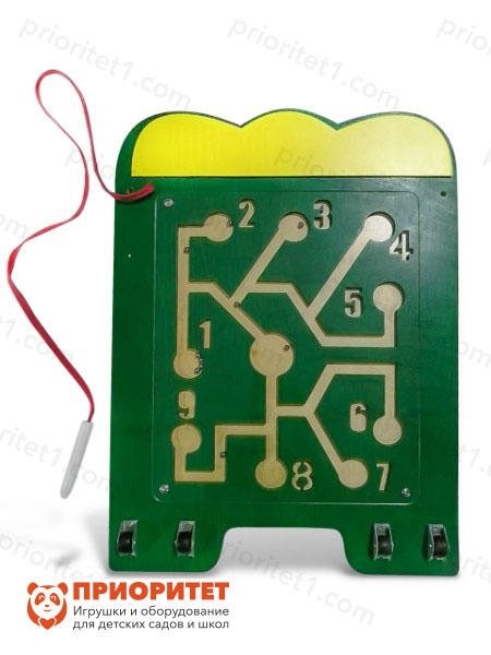 Модуль выполнен в форме одной из частей тела крокодила. Его можно использовать как самостоятельную конструкцию, так и в составе с другими частями из серии. Игра представляет собой резные дорожки, исходящие от центра, по которым нужно катать шарик, чтобы привести его к той или иной цифре. Зеленый цвет крокодила привлекает дополнительное внимание детей и вызывает интерес к игре. Благодаря занятиям с модулем у детей развивается координация, моторика, пространственное мышление, логика и обогащается тактильное восприятие. «Цифры» подходят для использования в образовательных и развивающих учреждениях и в домашних условиях.