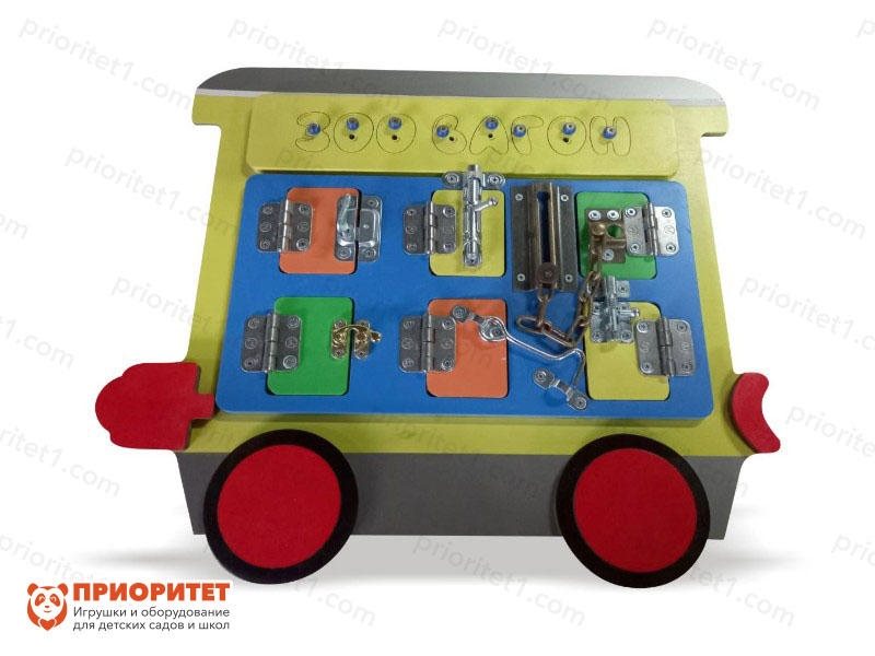 Модуль представляет собой вагон с окнами, закрытыми на замки. За каждой из ставен нарисовано то или иное животное, которое можно встретить в зоопарке. Бизиборд можно использовать в качестве самостоятельной развивающей игры или в комплекте с другими «Вагонами» и «Локомотивом». Яркие цвета и многочисленные элементы модуля вызывают интерес у детей и надолго привлекают их внимание. В процессе игры дети развивают интеллект, внимательность и самостоятельность, которую могут применять в домашних делах. Бизиборд – это отличное дополнение к развивающим играм в детских учреждениях и даже дома.