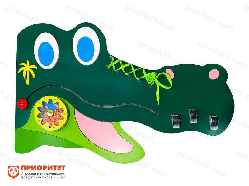 Модуль выполнен в виде улыбающейся головы крокодила. Каждый его элемент логически связан с заданным образом. Интерес детей вызывает как сама форма мультипликационного персонажа, так и яркие цвета, в которые окрашены все составляющие элементы. Модуль стимулирует укрепление визуального восприятия, развитие мелкой моторики, координации и логики.