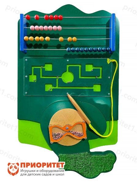 - Под счетами находится магнитный лабиринт, закрытый прямоугольником из прозрачного пластика. Металлические шарики по лабиринту перемещаются при помощи специального стилуса с магнитным наконечником. Стилус крепится шнурком к месту соединения пластиковой поверхности с основой модуля. Играя с лабиринтом, дети учатся ориентироваться в пространстве, искать решение для поставленной задачи и думать логически, прокладывая путь для шарика.