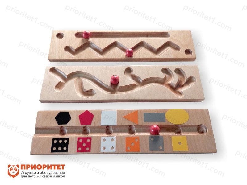 - «Ветер». Цель: укрепление мышц языка, развитие легких, улучшение дыхания. На дорожку устанавливается шарик. Задача ребенка - дуть на шарик так, чтобы переместить его с одной точки лабиринта на другую.