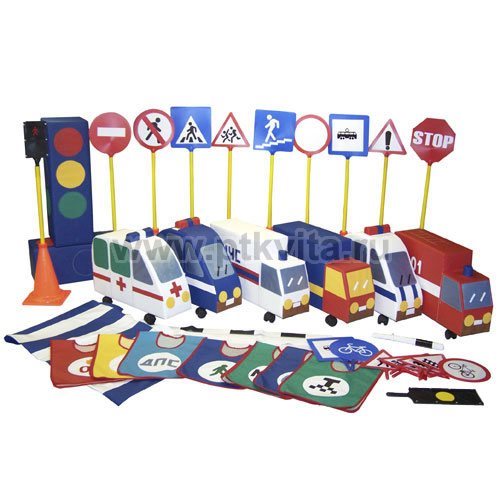 Комплектность: светофоры - 4 шт., жезл регулировщика - 1 шт., светофор пешеходный - 1 шт., жилет - 7 шт., разделительная полоса - 4 шт., ограничительная полоса - 6 шт., дорожные знаки - 18 шт., зебра - 4 шт., машинки-каталки (ДПС, Пожарная, Грузовик, МЧС, Скорая, Милиция) - 6 шт., стойка для дорожных знаков - 10 шт.