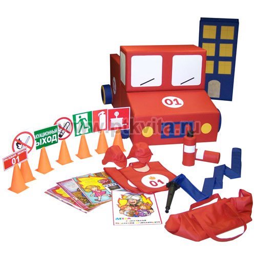 В комплекте: Машина пожарная (150*80*80 см.) - 2шт., комплект знаков по пожарной безопасности (7 шт.) - 2 компл., подставка для знаков - 14 шт., огнетушитель - 4 шт., жилет пожарного - 4 шт., шлем пожарного - 4 шт., макет здания (100*50*50 см.) - 2 шт., пожарный рукав (2,5 м.) - 2 шт., ограждения (брус 20*20*100см.) - 4 шт., сумка для инвентаря - 2 шт.