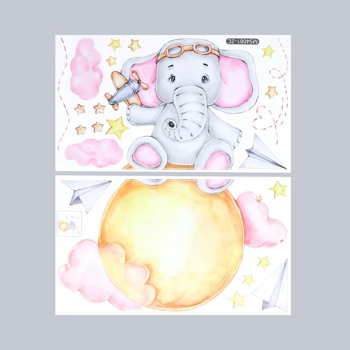 Наклейка интерьерная цветная «Слонёнок с самолётом», набор 2 листа, 30×60 см