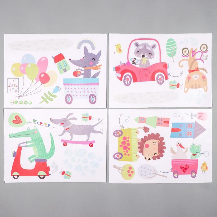 Наклейка пластик интерьерная цветная "Зверята и транспорт" 25х35 см набор 4 листа