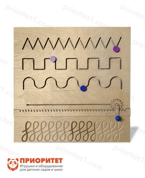 Модуль изготовлен из прочной обработанной фанеры с вырезанными в ней дорожками разной конфигурации: углообразными, прямоугольнообразными, волнообразными линиями внутри которых размещены бегунки. А также прямой на которой закреплен зубчатый бегунок с ручкой что позволяет перемещать его вправо и влево. Внизу планшета вырезана ложбинка в форме фигурного узора. Перемещение бегунков проходит вдоль прорези, тем самым обучая детскую руку правильному положению, контролю и базовым движение.