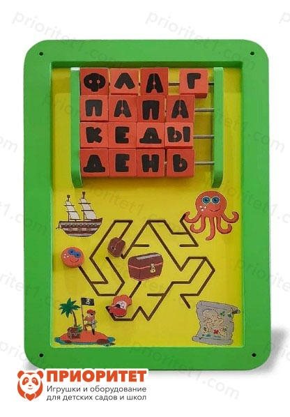 Панель представляет собой набор из игровых и развивающих элементов. Яркие цвета привлекают внимание детей, а лабиринт интригует и стимулирует развитие логического мышления. Благодаря картинкам пиратской тематики и богатому детскому воображению, можно отправиться в морское путешествие, освоить карту, найти сундуки с сокровищами, побороть страшного Кракена и побывать на необитаемом острове. Оборудование подходит для использования в детских садах, развивающих центрах и в домашних условиях.
