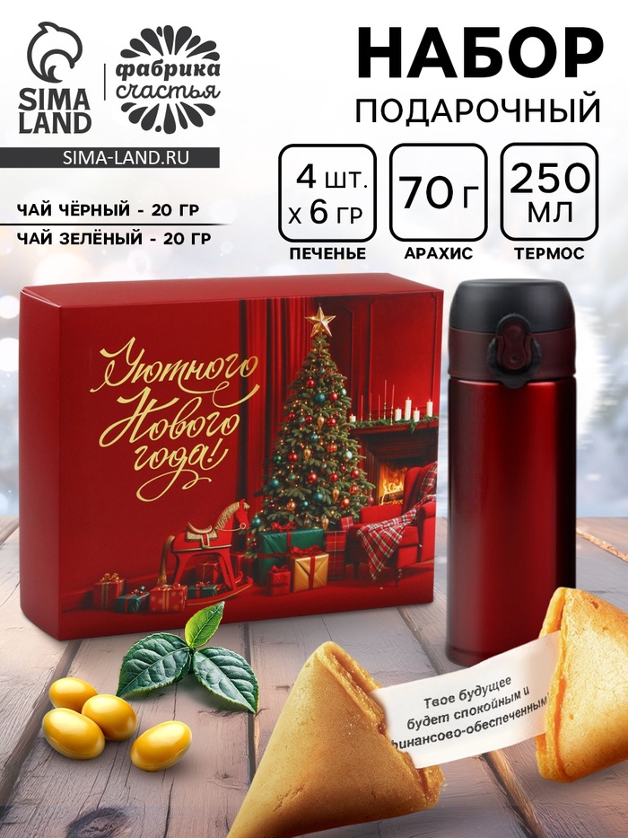 Подарочный набор «Уютного Нового года»: термос, чай чёрный/зелёный, печенье с предсказанием, арахис в шоколадной глазури