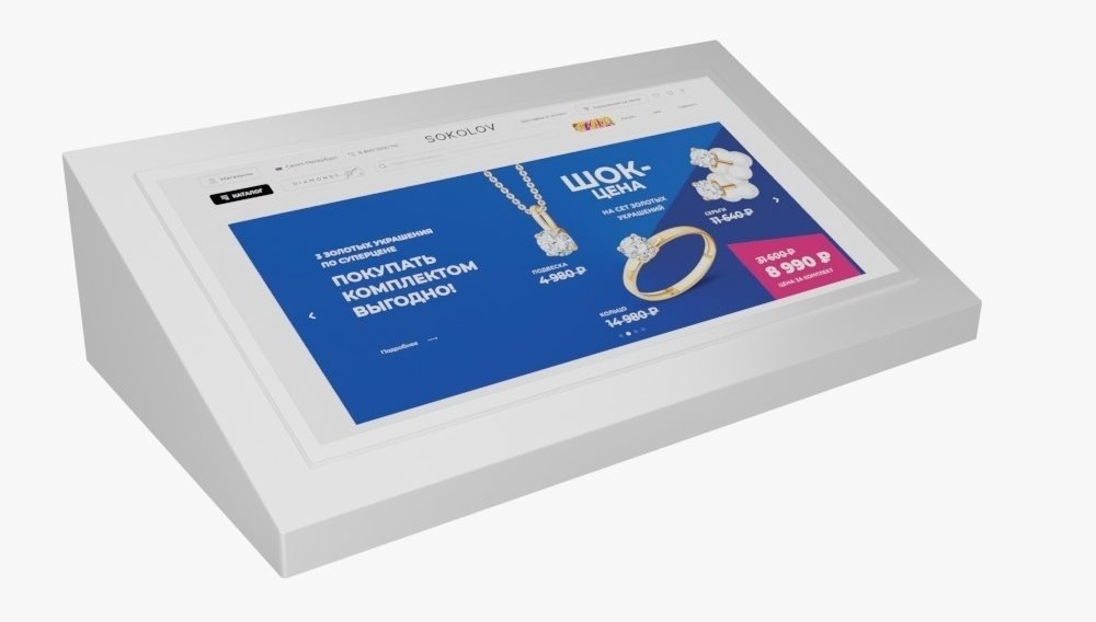 Сенсорный стол для бренда SOKOLOV является уникальным по функционалу и дизайну устройством. Он легко интегрируется в витрины и создает единое целое с островком. Прочный и долговечный экран, вписанный в стол достаточно яркий, чтобы его было хорошо видно в светлом помещение ТЦ, подчеркивает красоту и качество всего ассортиментного ряда украшений. Менеджеры, работающие на островке теперь могут проводить презентации клиентам, используя большой экран, показывать видео и фотосессии, демонстрировать украшения во всей красе, даже если их нет на витрине. Результаты говорят сами за себя - каждый десятый клиент, воспользовавшийся устройством, совершает покупку. Для оборудования было разработано уникальное программное обеспечение. Мы также предусмотрели возможность масштабирования устройства для использования на других островках SOKOLOV с подобным форматом продаж.