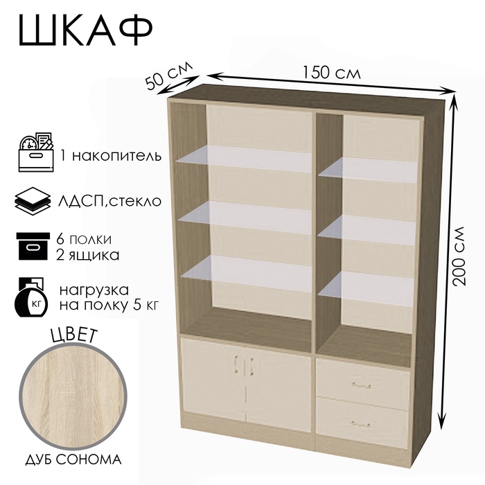 Особенностью модели является наличие шести полок, выполненных из стекла, визуально расширяющих пространство комнаты и подчёркивающих глубину интерьера. Размеры шкафа — ширина 1500 мм, глубина 500 мм и высота 2000 мм — предоставляют достаточно места для хранения одежды, обуви, постельных принадлежностей и прочих необходимых вещей.