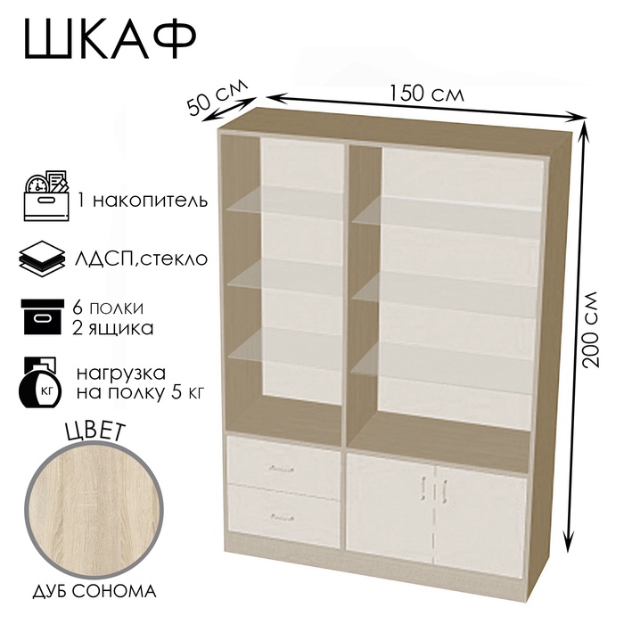 Размеры шкафа — ширина 1500 мм, глубина 500 мм и высота 2000 мм — созданы специально для оптимального размещения одежды и аксессуаров. Полезное пространство разделяется на шесть функциональных зон, каждая из которых выдерживает нагрузку до пяти килограммов, обеспечивая безопасность содержания и удобство доступа.