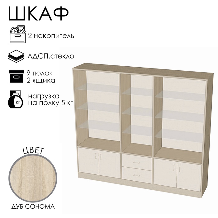 Главные преимущества шкафа заключаются в размерах — длина 2300 мм, глубина 500 мм и высота 2000 мм, позволяющие максимально рационально распорядиться доступным пространством. Особого внимания заслуживает также расположение девяти удобных полок, выполненных из надежного ЛДСП и стекла, способных выдержать нагрузку до пяти килограммов каждая.