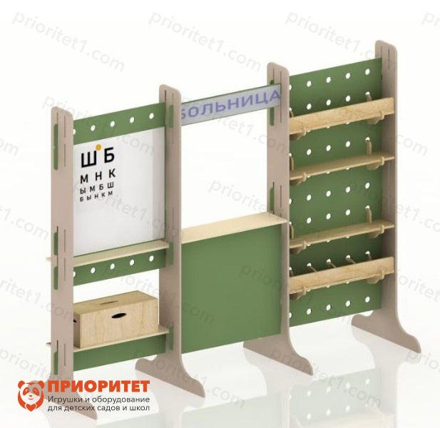 Ширма «Больница» представляет собой интерактивное образовательное решение, ориентированное на учебные заведения различного уровня. Набор включает в себя элементы, позволяющие воссозлить ситуации, связанные с работой в медицинской сфере, а также исследовать механизмы взаимодействия и взаимоотношений в обществе.
