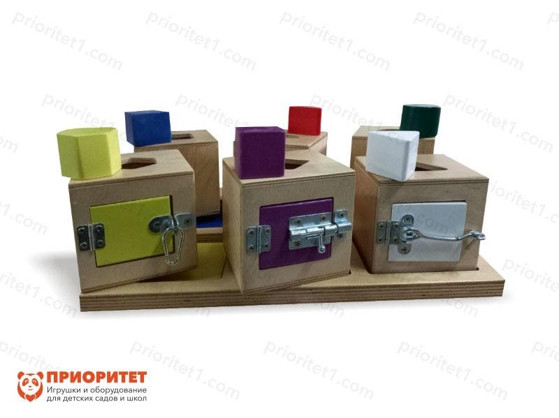 Сортер «Кубики с замочками» увлекательная логическая игра для детей младшего дошкольного возраста. В наборе 6 фанерных кубиков с дверцами, замочками и отверстиями, в которые вкладываются фигуры, подходящие по форме и размеру. Для того, чтобы достать фигурки нужно открыть замочки.