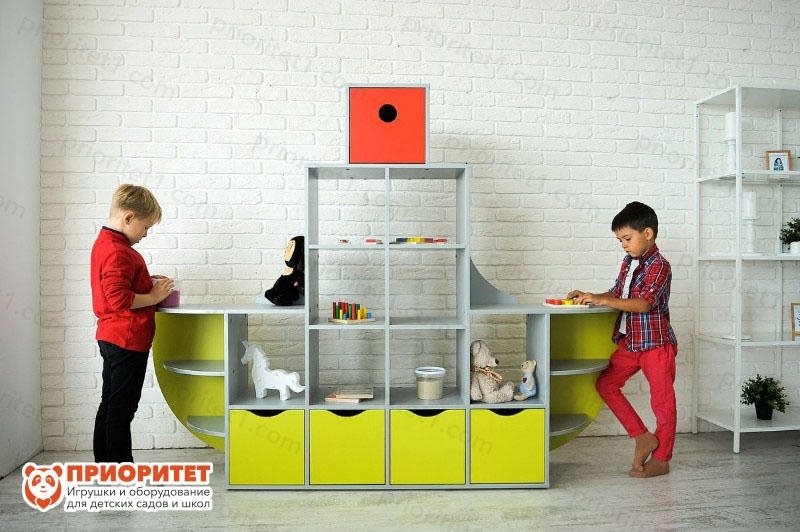 - Объединение нескольких функций в одном стеллаже. По бокам размещены рабочие поверхности, за которыми размещается несколько детей.