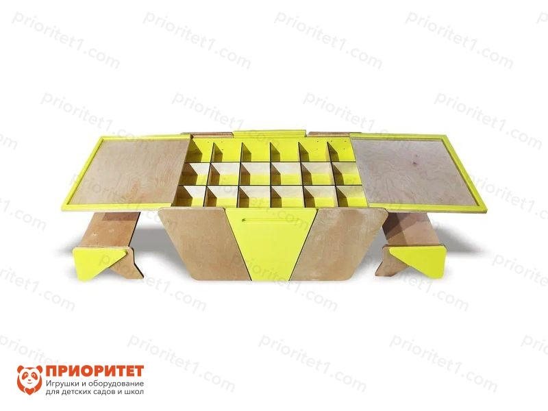 Стол создан специально для работы с группой детей, но также подходит и для индивидуальных занятий. Две раздвижные столешницы открывают пространство для хранения необходимых деталей для занятий по конструированию. Процесс работы с конструктором вместе со столом «Трансформер» будет легким и непринужденным, а также дети будут лучше воспринимать формы и величину объектов, цвета.