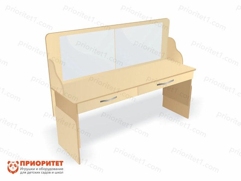 Зона для индивидуальных занятий в кабинете логопеда оформляется по установленным правилам. Этот стол имеет все необходимые элементы для организации процесса обучения. Рабочая зона столешницы большая, за ней легко разместятся два ученика или дошкольник с логопедом. Предусмотрены выдвижные ящики, в которых можно хранить документы, специальное оборудование и развивающие пособия. Зеркало необходимо для отработки правильного звукопроизношения и выполнения артикуляционной гимнастики.