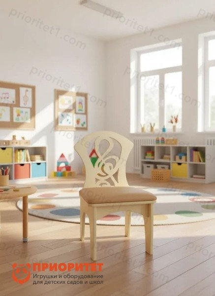 - Детский стул из натурального дерева отличается изысканным дизайном и комфортным сиденьем. Спинка стула представляет собой скрипичный ключ. Ажурный узор создает праздничную атмосферу.