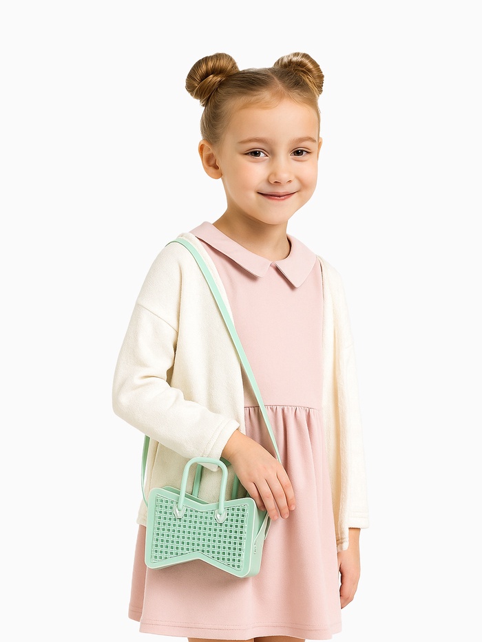 Эта сумка становится первым шагом к самостоятельности — в нее можно сложить носовой платок, маленькую игрушку или фрукты для прогулки. Регулируемый ремень позволяет носить ее через плечо или в руке, как взрослая сумка. Легкий материал и удобная форма делают ее верным спутником для первых походов в гости или детский сад, где каждая девочка хочет чувствовать себя совсем взрослой.