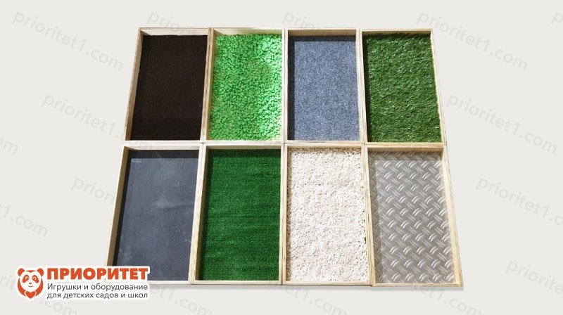 - Представляет собой восемь небольших ящик с предметами разных текстур: ковролин, трава, бархат и пр. Конструкцию удобно хранить в углу комнаты: ящики устанавливаются друга на друга и легко переносятся.