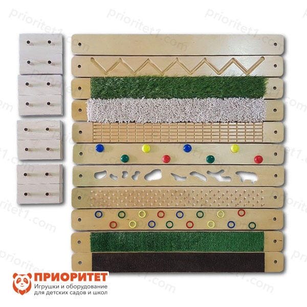 - 6 дощечек с разными поверхностями, среди которых: веревочное плетением отверстия различной формы, наклеенные полусферы и кружочки, канавки и решетки.