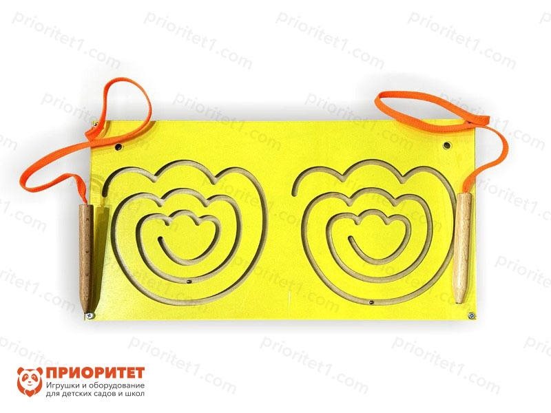 - Представляет собой прямоугольную панель с резными путями, по обе стороны которой имеется симметричный рисунок и два привязанных стилуса. Задача малыша – провести стилусы по игровому пути. Игра будет окончена, когда малыш научиться делать это одновременно.