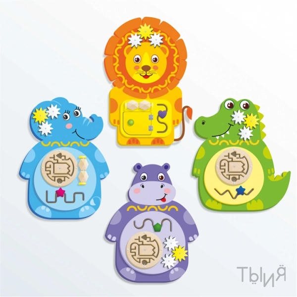 Комплект Бизибордов “Животные Африки” представляет собой набор из четырёх настенных развивающих панелей — Крокодил, Слон, Бегемот и Лев, предназначенных для детей от 1 до 5 лет. Продукт разработан для использования в детских садах, центрах раннего развития и школах. Компактные размеры позволяют эффективно размещать панели даже в помещениях с ограниченным пространством.
