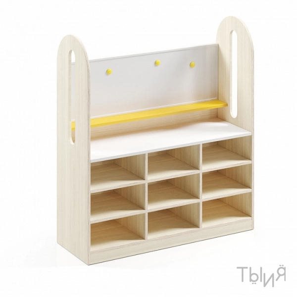 - Оснащение: 9 открытых полочек, магнитно-маркерная доска, полочка, скрытые мебельные колесики